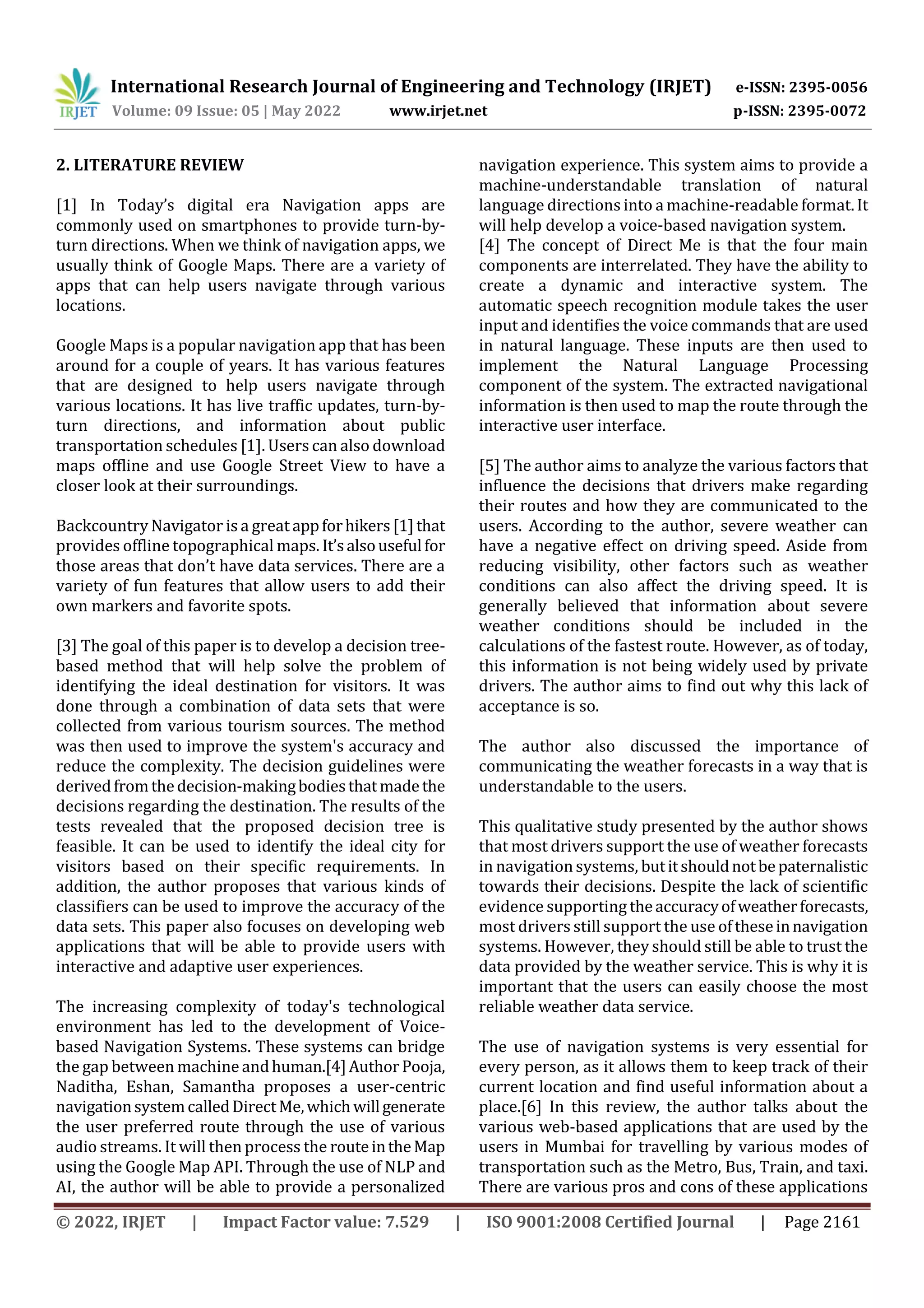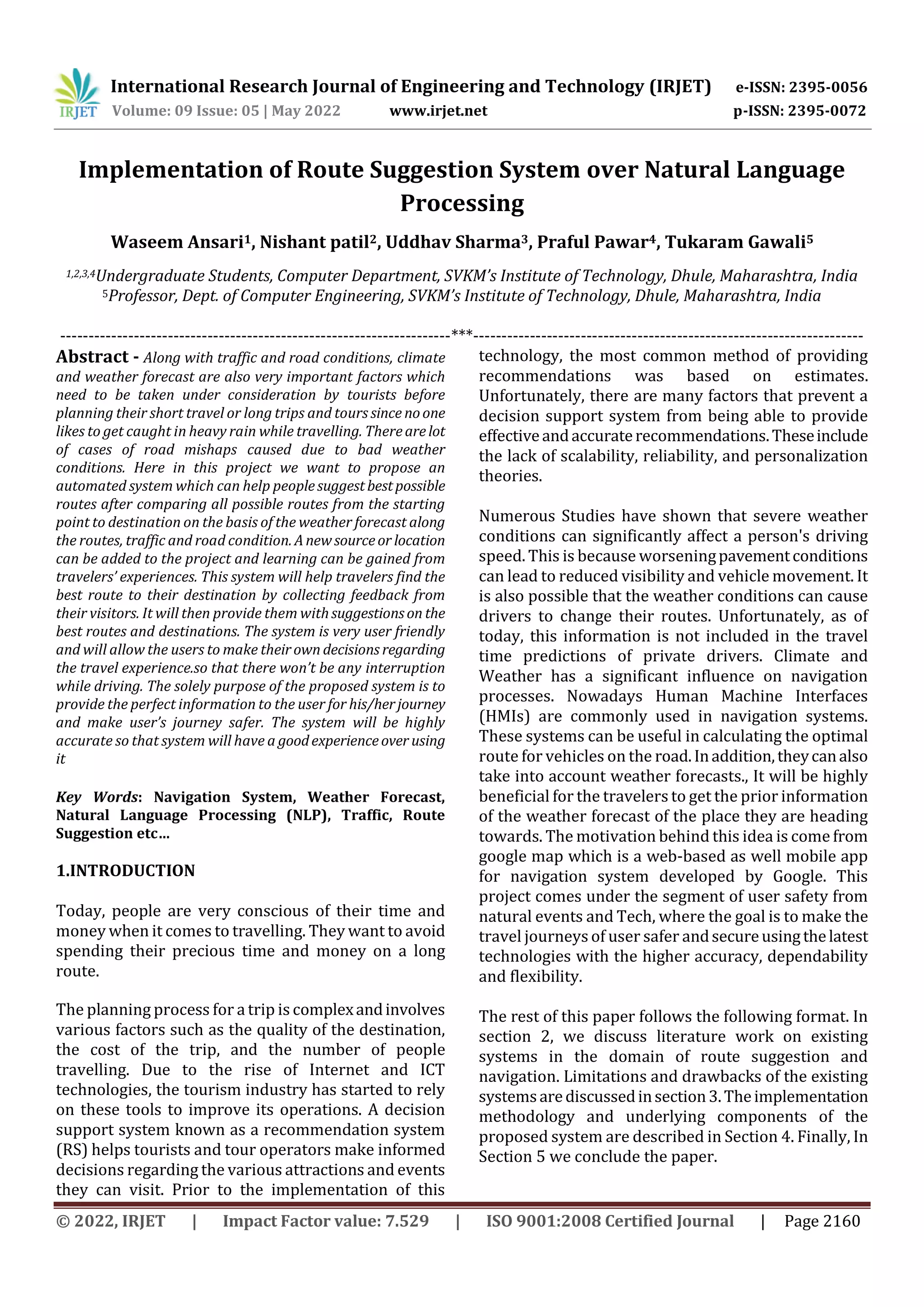 This document proposes a route suggestion system that uses natural language processing to recommend optimal routes for travelers based on real-time weather forecasts, traffic conditions, and feedback from other travelers. The system would accept either a source and destination from the user, or a natural language description of the intended route if precise locations are unknown. It would then use mapping APIs to obtain potential routes and integrate data from weather and traffic APIs to evaluate conditions along each route. The best route would be returned to the user in text format and also voiced back using text-to-speech. The system aims to make travel safer and more efficient by informing users of real-time conditions along potential routes.