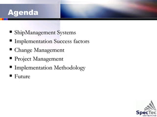 The document discusses key factors for successful implementation of ship management systems. It identifies top reasons implementations fail such as lack of change management and training. Critical success factors include top management support, a dedicated team, and using a proven project management methodology. The methodology involves phases like defining requirements, configuring the system, user training, and going live. Adhering to best practices like clear objectives and readiness criteria can help ensure the system pays off for the organization.
