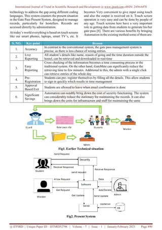 The document discusses the implementation of a smart and secure gate pass system using QR codes to enhance student safety in educational institutions. This automated system aims to streamline the traditional manual process of managing gate passes by enabling digital tracking of student departures and arrivals, ultimately reducing paperwork and improving efficiency. The proposed solution features an easy-to-use web application with modules for authentication, form filling, and data storage, ensuring accurate and real-time record management.