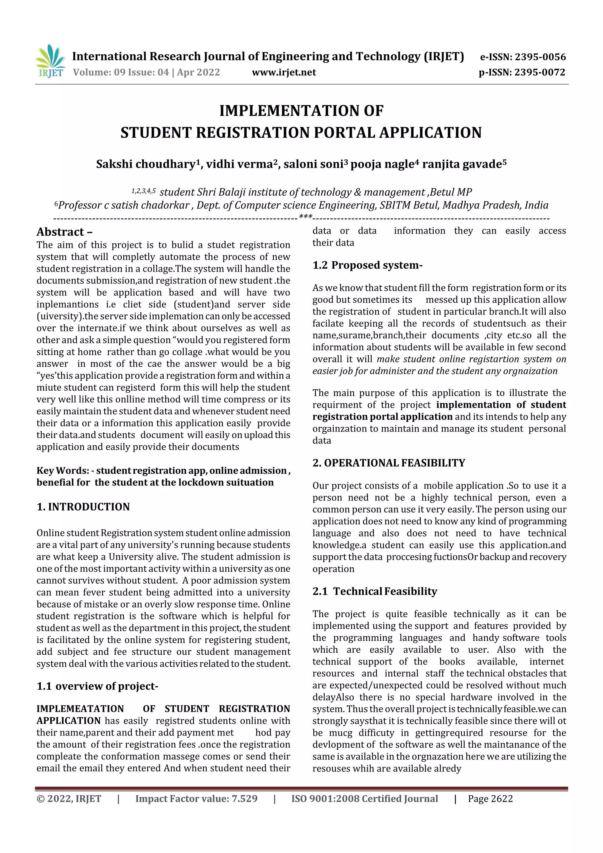 1. The document describes the implementation of a student registration portal application to automate the process of new student registration.