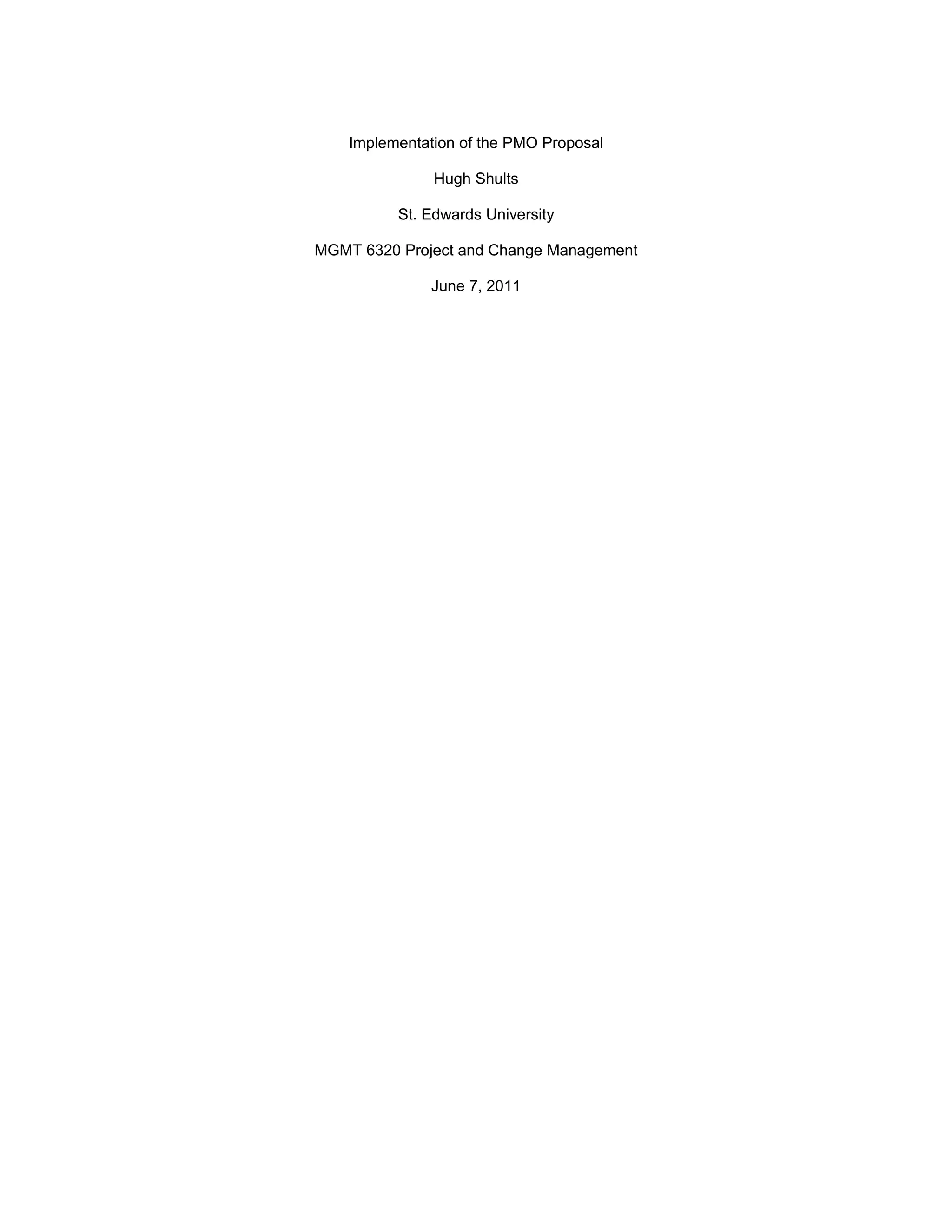 The proposal is for implementing a Project Management Office (PMO) at Federal Signal Technologies to improve project management capabilities. The PMO will operate independently to provide standardized processes, tools, and reporting across projects. It will be implemented in phases over 12 months to establish governance, assess maturity, deploy standards and tools, and ensure portfolio and project alignment with business goals. Key activities include socializing the PMO charter, conducting training, and measuring returns through improved costs, schedules, and stakeholder satisfaction. Initial costs are estimated at $136,417 over six months.