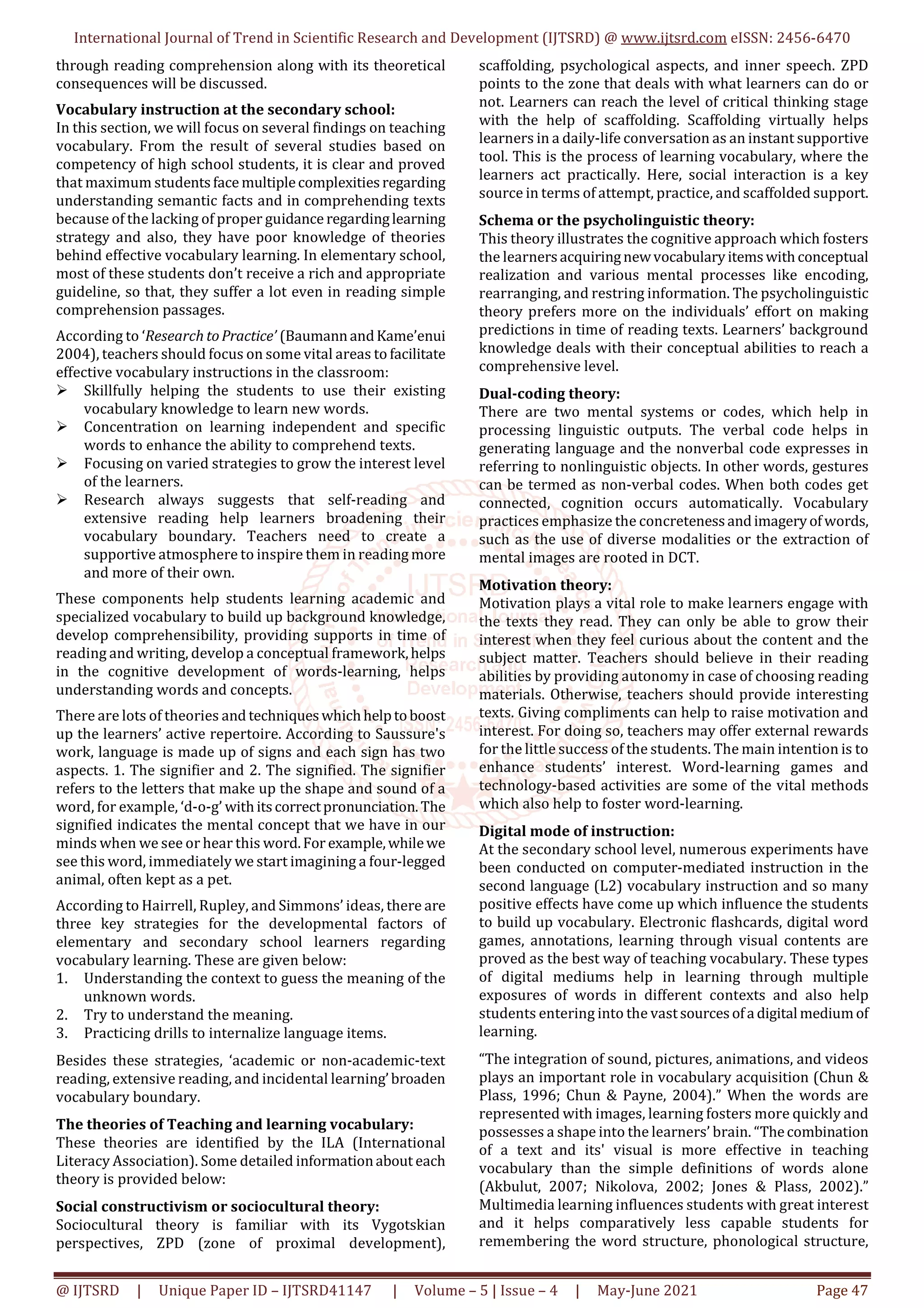 This study examines the implementation of vocabulary teaching strategies at the secondary school level, emphasizing the gap between theoretical knowledge and practical application in vocabulary instruction. It highlights the challenges students face in vocabulary comprehension and suggests various methodologies, including digital tools and contextual learning, to enhance vocabulary acquisition. The research aims to provide guidelines for effective vocabulary instruction and address the cognitive and psychological aspects of vocabulary learning.