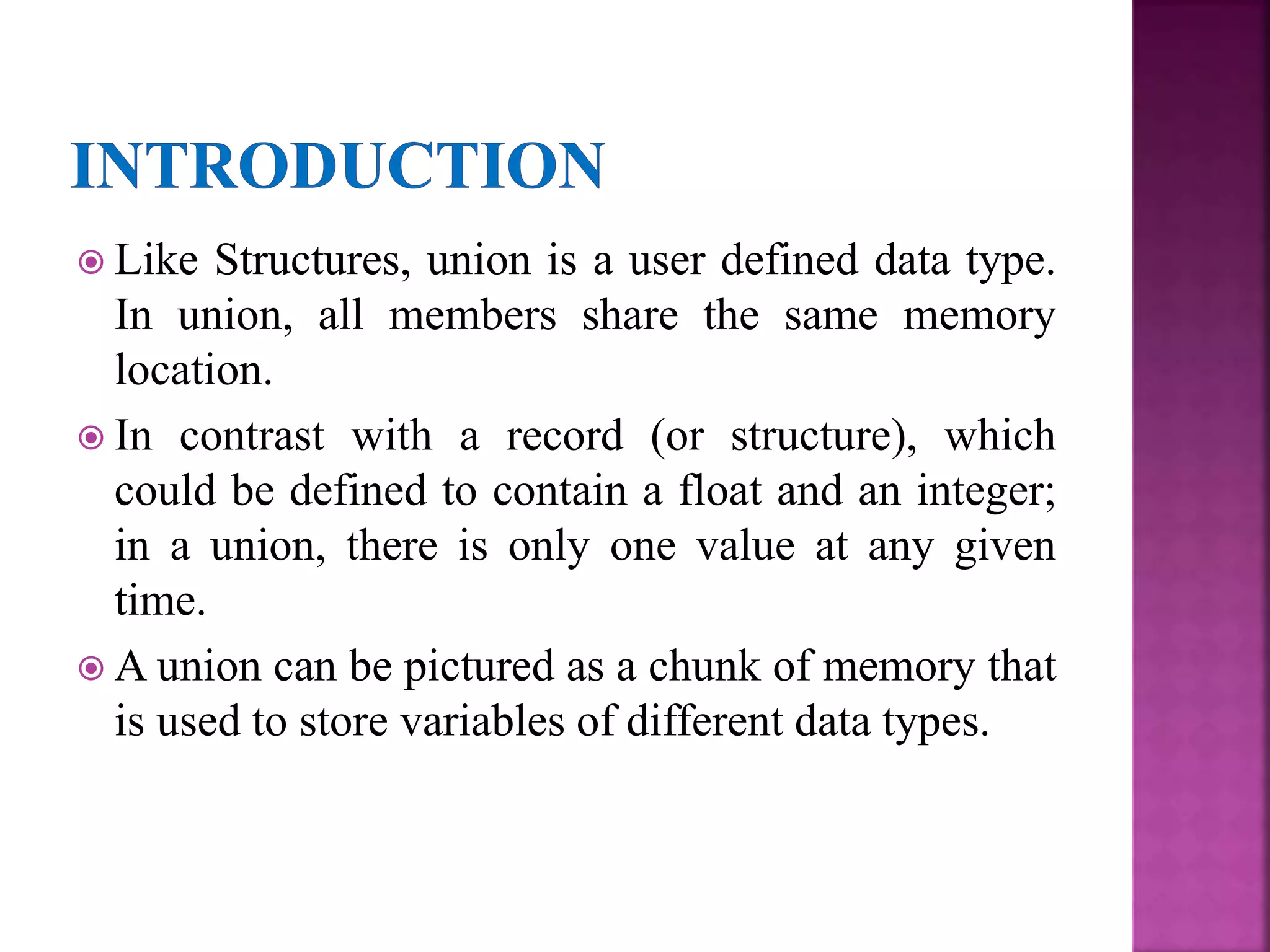 This document discusses unions in programming. It explains that in a union, all members share the same memory location, whereas a structure contains separate memory for each member. Only one member value can exist in a union at a time. There are two approaches to applying union operations: union by height, which makes the tree with the smaller height a subtree of the other; and union by weight, which makes the tree with fewer elements a subtree. Path compression is an optimization technique for union-find that flattens the tree structure during find operations by making each found root the new parent of its children, improving worst-case time complexity from linear to logarithmic.