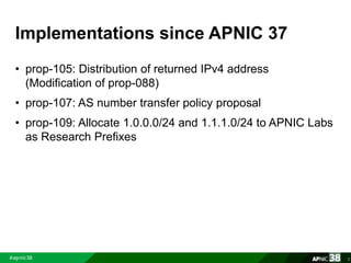 This document summarizes IPv4 and IPv6 policy implementations and updates from APNIC. It discusses the distribution of returned IPv4 address blocks from IANA to APNIC, including an initial allocation of several blocks. It also reviews the implementation of policies allowing the transfer of AS numbers between organizations and the allocation of research IPv6 prefixes.