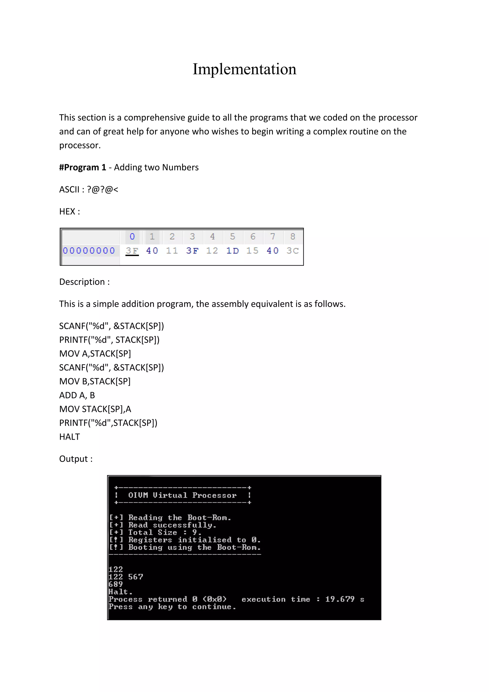 This document provides summaries of 7 programs coded on a processor. Program 1 adds two numbers, Program 2 implements a while loop to decrement a number until it reaches zero, Program 3 creates an array and displays elements in reverse order, Program 4 encrypts input by adding 5 to each element, Program 5 performs a linear search, Program 6 decrypts an encrypted ROM on the fly, and Program 7 dynamically expands a compressed program on the fly.