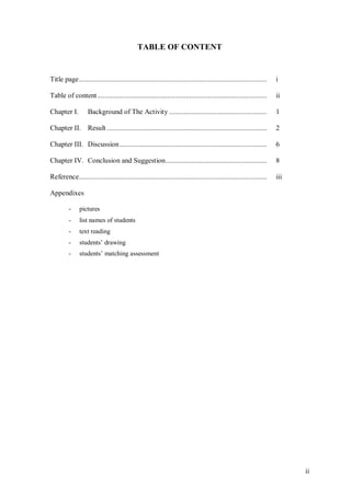 This document summarizes activities conducted to teach English to young learners using media. The activities took place at SDN 3 Kendal Ngawi and involved 11 fourth grade students learning about parts of the body. Various media were used, including videos, pictures, and drawings. Activities included singing a song while touching body parts, listening and repeating part names, a "what's missing" game where students identified removed body parts, and drawing parts based on clues. Students were engaged and interested in the media-based activities compared to traditional lecture-style teaching. The document concluded the media helped students learn faster and more enjoyably.