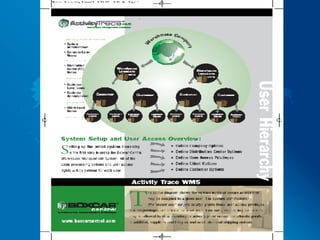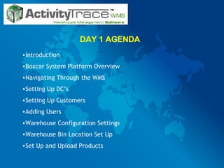 The document is a 3-day training agenda for implementing a warehouse management system called Boxcar Central. Day 1 covers an overview of the system, setting up distribution centers and customers. Day 2 reviews purchase orders and sales orders, and day 3 covers billing, reporting and other modules.