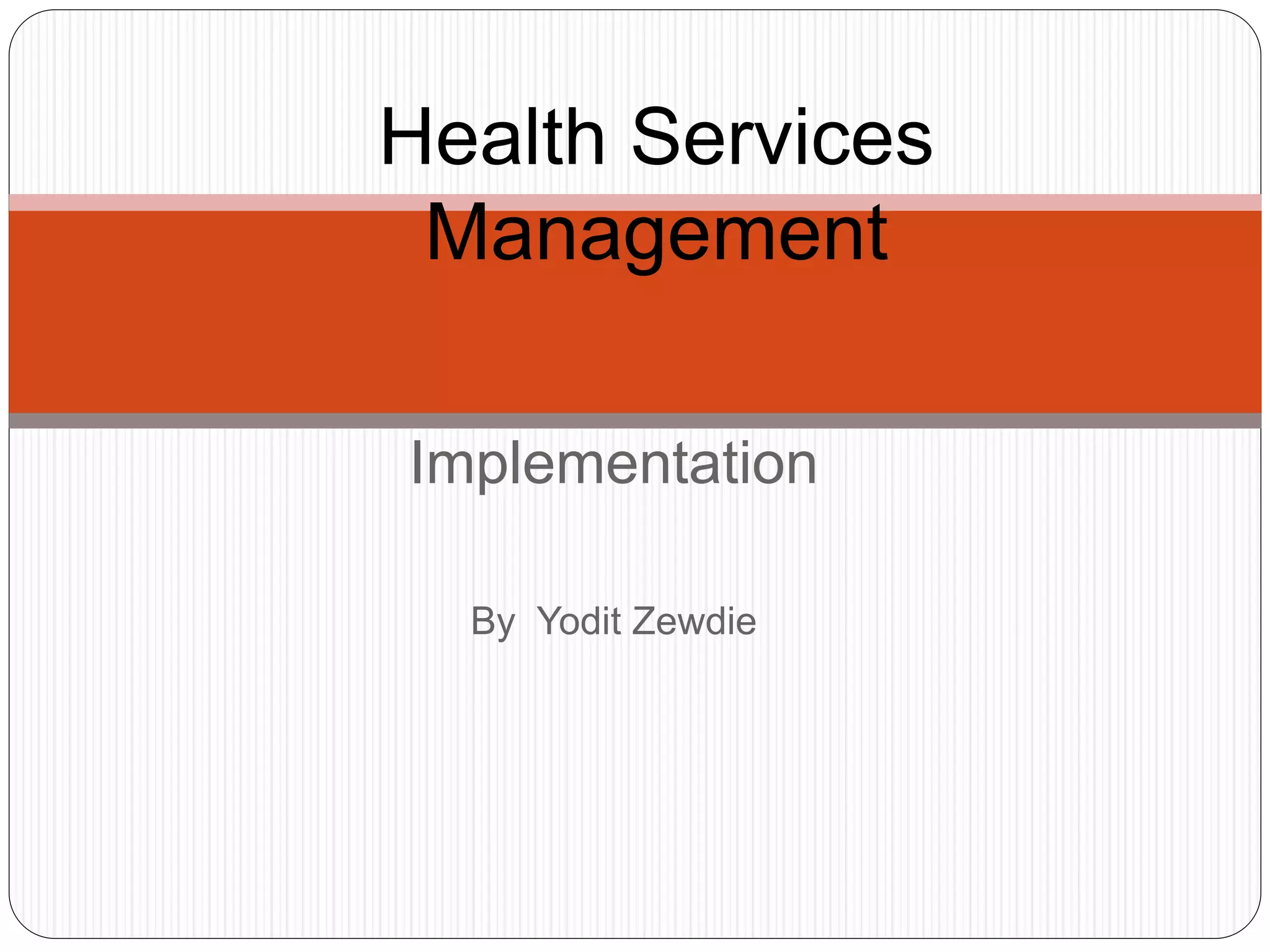 The document outlines the essential functions of health services management, focusing on the implementation process, which includes organizing, monitoring, and supervising activities within health service organizations. It emphasizes the importance of effective organizational structures, departmentalization methods, and various supervisory styles to enhance coordination and improve service delivery. Additionally, it details the mechanisms of monitoring and redirecting efforts to ensure quality outcomes in health care.