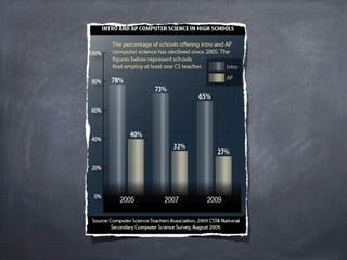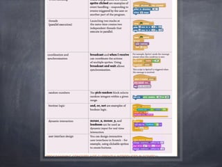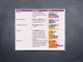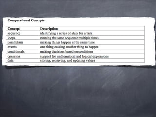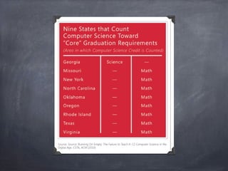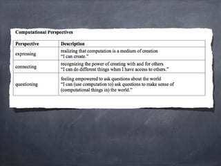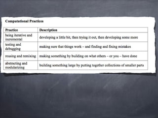 The document discusses implementing a computer programming curriculum in school districts. It recommends introducing programming concepts and skills like Scratch, Lego WeDo, Lightbot and Logo in grades 5-8 to help students develop skills like systems thinking, creativity, collaboration and problem solving. These "habits of mind" are essential for citizens in the 21st century. Standards from organizations like CSTA and ISTE are referenced. Examples of curricula using tools like Scratch, robotics kits and game design software are provided.