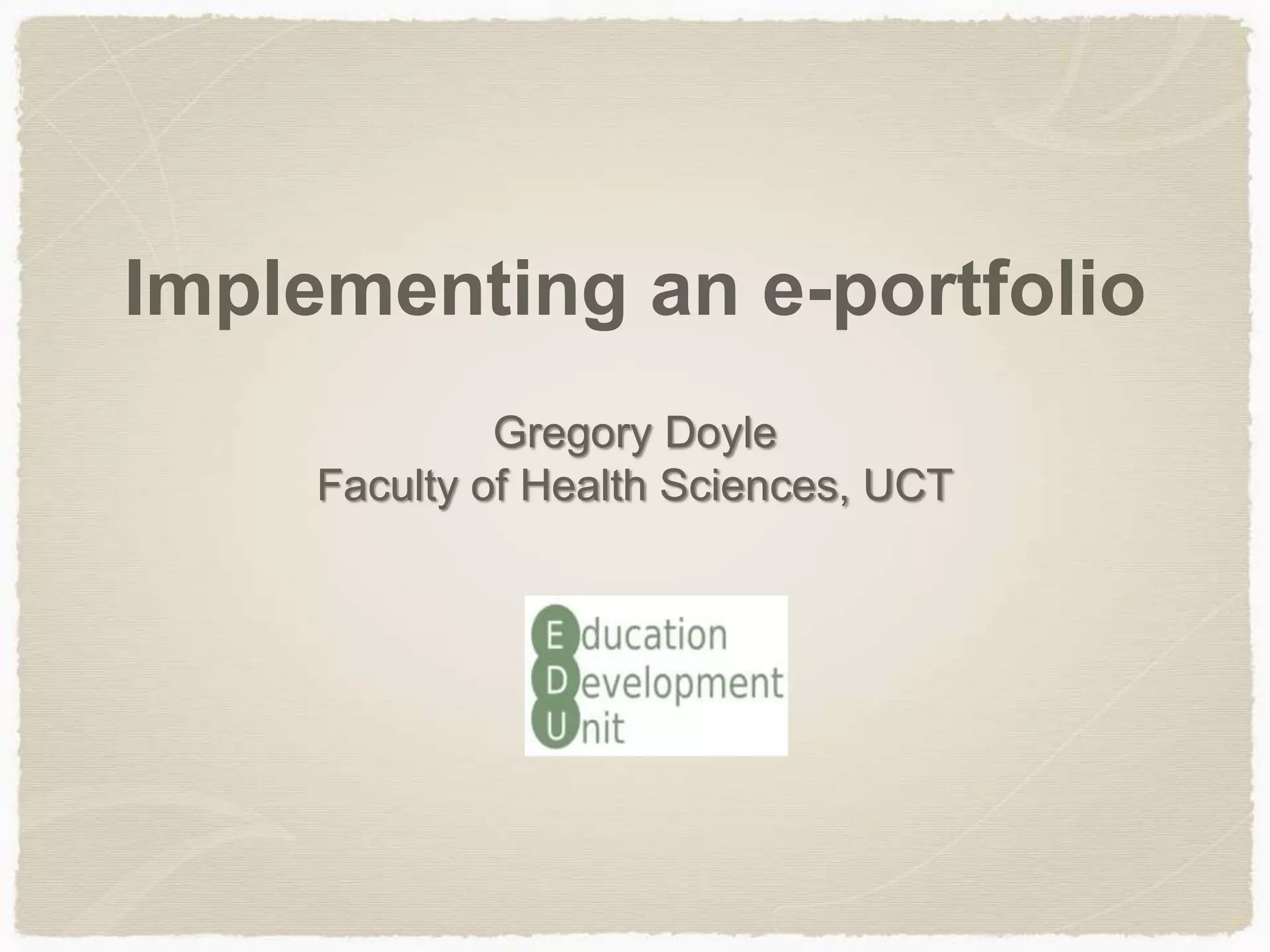 This document discusses implementing e-portfolios using Google Sites. It notes the goals of e-learning include supporting problem-based learning and enhancing student engagement. The intended outcomes of e-portfolios are to embed graduate attributes, develop digital literacies, and increase student reflection and self-awareness. Challenges include combining different artifacts and ensuring portfolios are lost, secure, portable and reusable. Advantages of e-portfolios include enhancing the reflection process and developing a lifelong learning tool. Google Sites is proposed as the tool as it integrates well with other Google tools and has online support. A phased implementation approach is outlined.