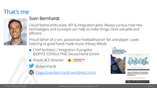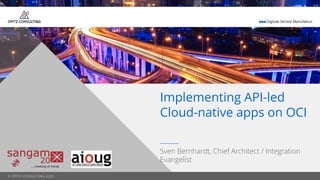 The document discusses the implementation of API-led cloud-native applications on Oracle Cloud Infrastructure (OCI), emphasizing the advantages of cloud-native development such as increased scalability, flexibility, and speed to market. Key concepts include API design-first approaches, environment parity, and the use of modern tools and services such as Oracle Container Engine for Kubernetes, OCI API Gateway, and Helidon for developing microservices. The summary highlights that consistent and intuitive API design is crucial for the adoption and success of cloud-native applications.