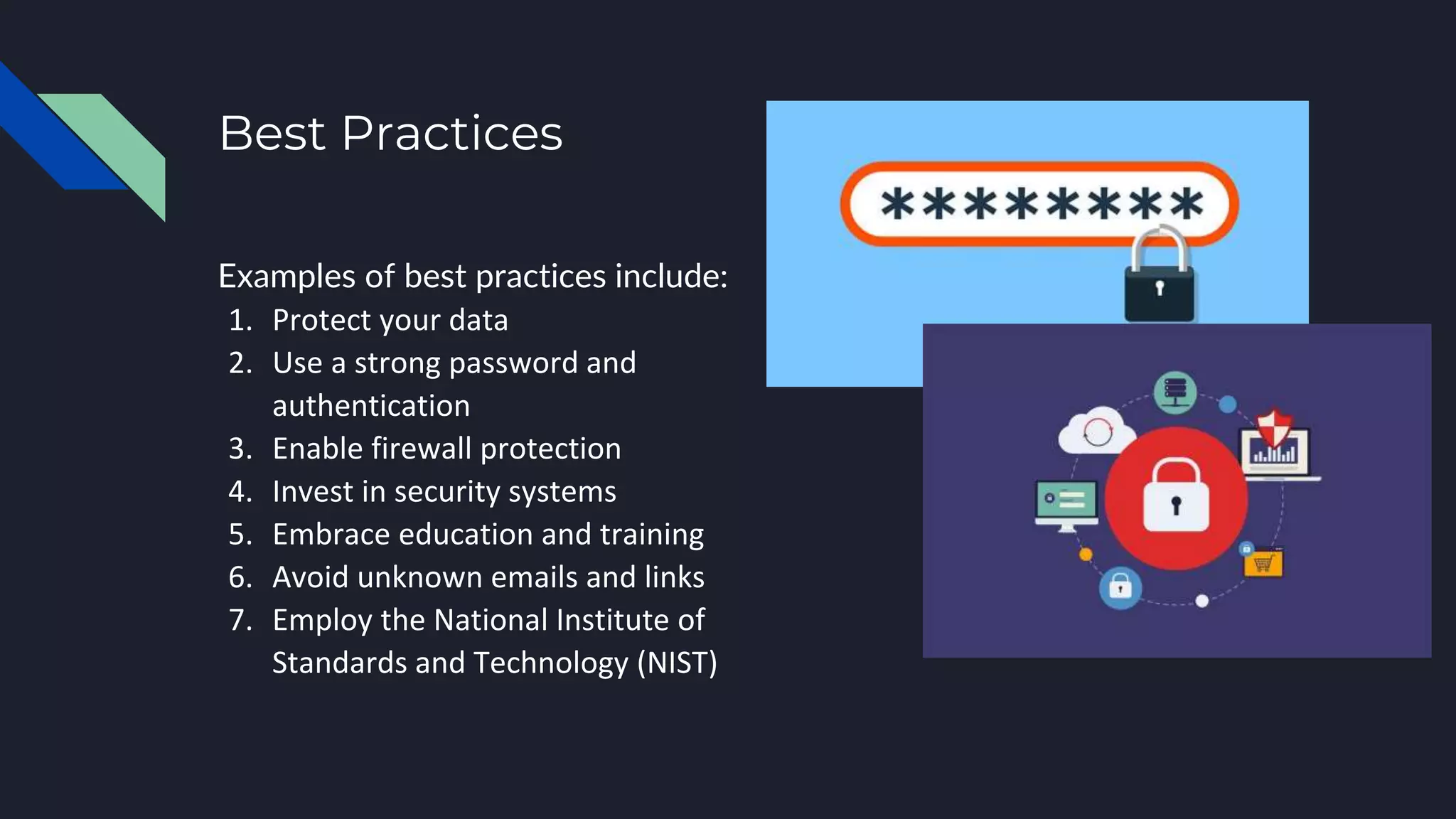 This document discusses implementing cybersecurity best practices and new technology. It provides examples of cybersecurity best practices like using strong passwords and enabling firewall protection. It also discusses common cyber attacks such as malware, SQL injections, and phishing scams. The document then covers best practice implementations for organizations, examples of new technology, and recommendations for evaluating successful integration of new technology. The overall goal of implementing cybersecurity best practices and new technology is to safeguard the organization from attacks and increase output.