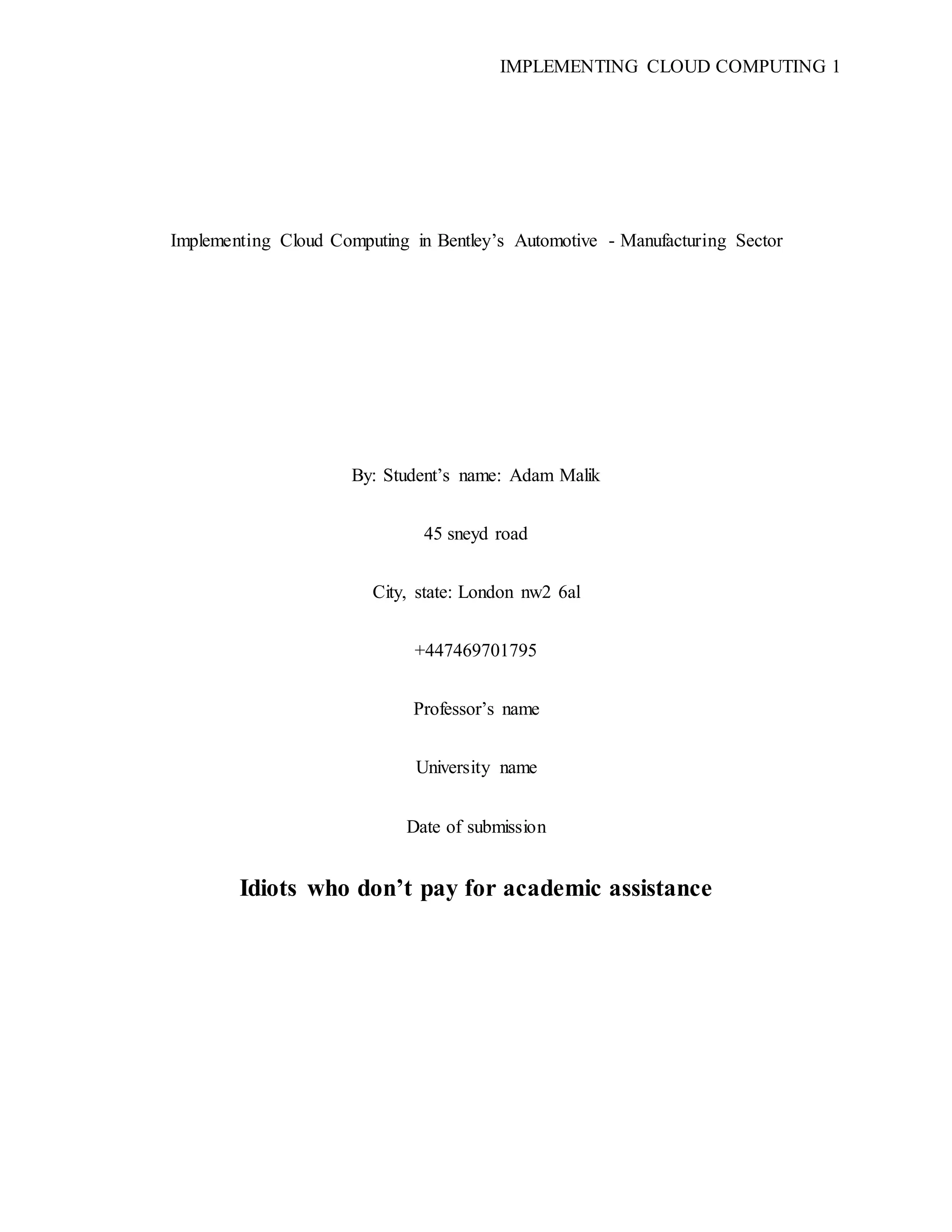 This document discusses implementing cloud computing at Bentley Motors, an automotive manufacturer. It provides background on Bentley Motors, describing its sales, staff levels, and existing information systems. It then defines key aspects of cloud computing, including deployment models, service models, and characteristics. The document suggests cloud computing could benefit Bentley Motors by improving efficiency and consumer satisfaction, but may also present security risks that would need to be addressed for successful implementation.