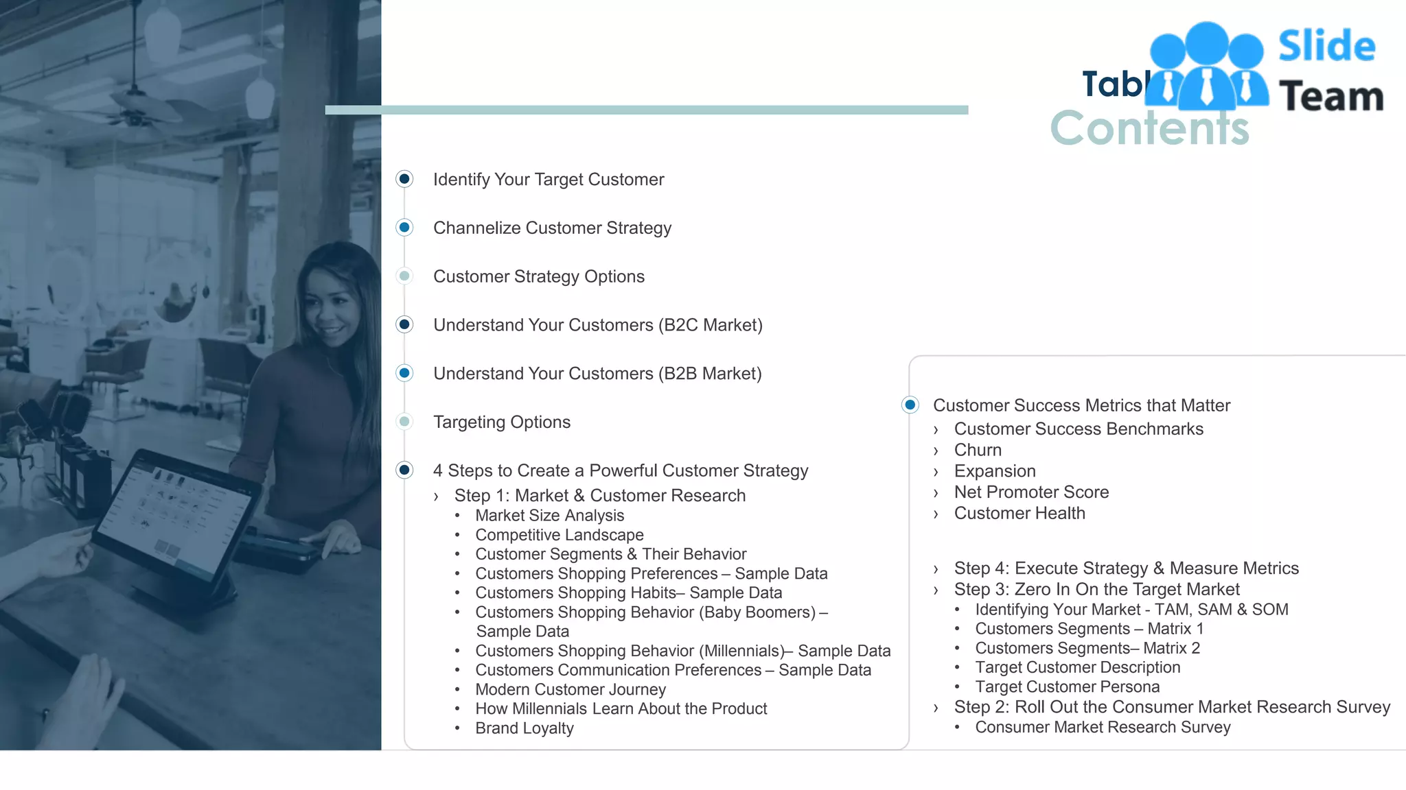 The document provides a comprehensive guide for implementing a customer strategy, outlining steps for market and customer research, defining target markets, and developing effective customer segments. It includes various customer characteristics and preferences, as well as metrics for measuring customer success, emphasizing the importance of aligning customer strategy with business goals. Additionally, it discusses the modern customer journey and offers techniques for gathering consumer insights through surveys.