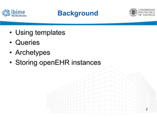 2. It describes some open-source tools for working with archetypes, such as the LinkEHR Archetype Editor, and experiences using archetypes at hospitals in Spain.