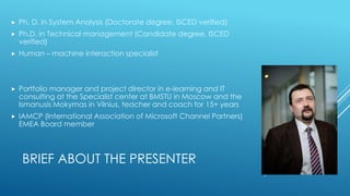 The document discusses the implementation of e-learning and combined training methods aimed at engaging a diverse student demographic. It outlines the presenter's experience in launching training methods, the advantages of blended learning approaches, and the demand for flexible learning environments. Additionally, it highlights the success of various educational programs and tools developed to facilitate remote and virtual learning.