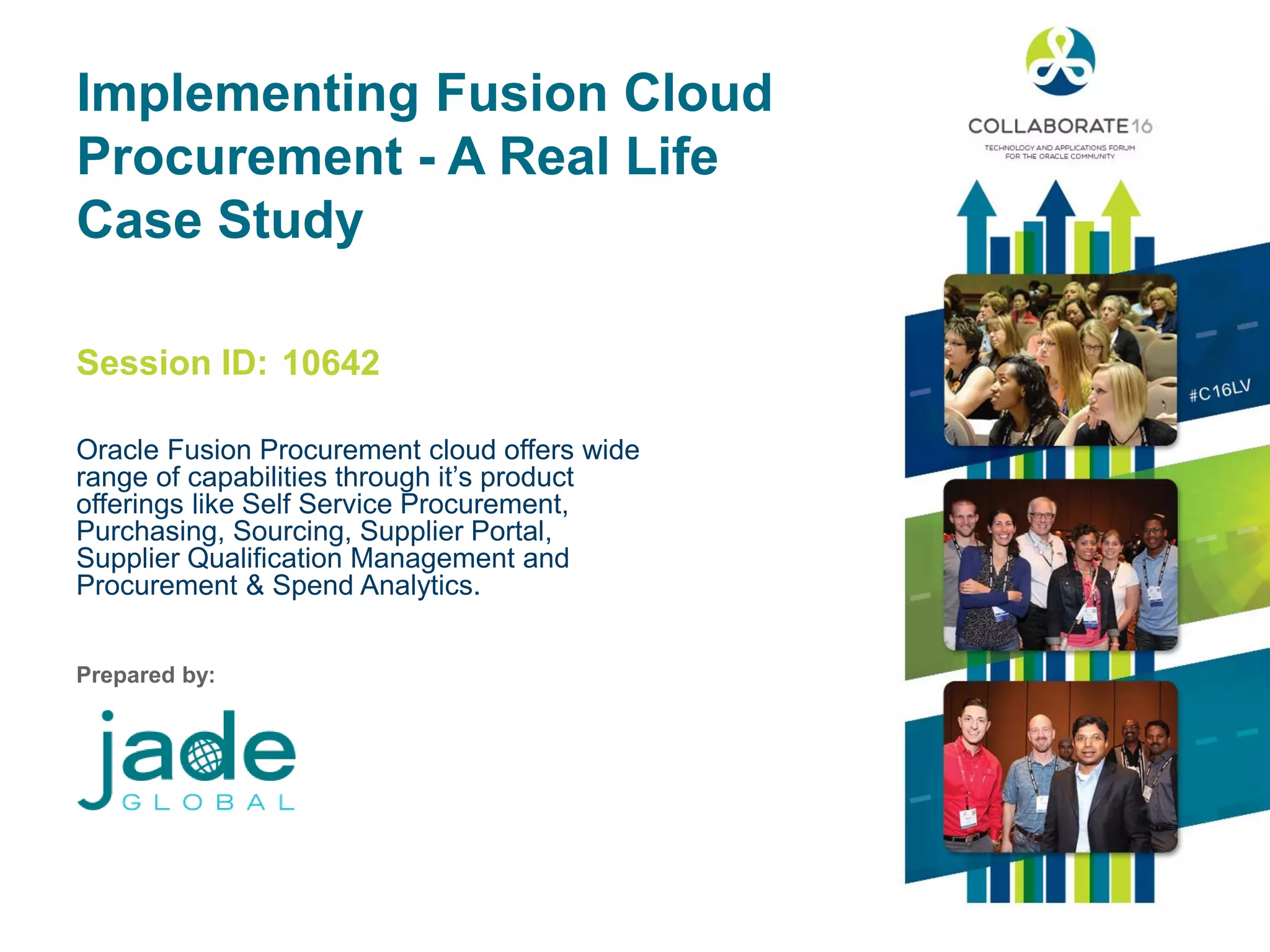 The document discusses implementing Oracle Fusion Cloud Procurement for a client. It outlines the client's requirements, key challenges, and Jade Global's solution of using Fusion Cloud Procurement. The solution provides a user-friendly application, easy configuration of approvals, and integrated reports tailored to business roles. It allows for rapid implementation, accuracy in transactions, flexible accounting, and document change history. This results in benefits like best practices, spend control, reduced cycle times, and increased productivity and security for the client. Critical success factors include real-time reporting, role-based access, reduced costs and increased productivity through an integrated procurement system.