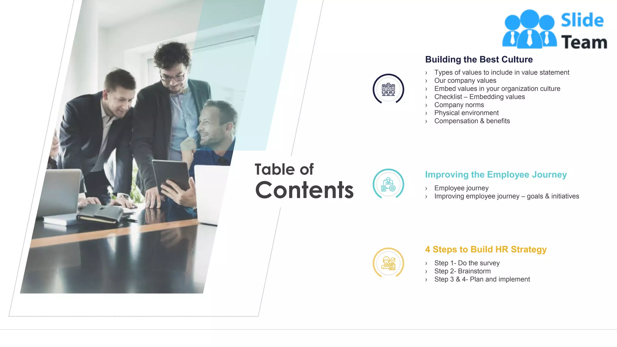 The document outlines strategies for implementing HR practices focused on enhancing employee journeys and cultivating a positive work culture within an organization. It provides detailed steps for building an HR strategy, embedding core values throughout the employee lifecycle, and improving engagement through various initiatives. Key components include a value statement, company norms, compensation strategies, and methods for evaluating employee satisfaction and performance.