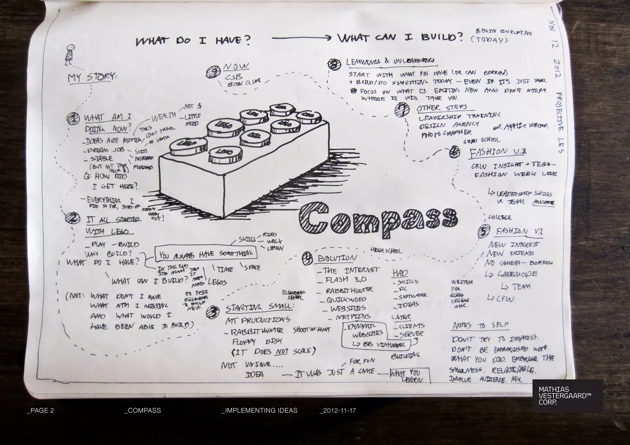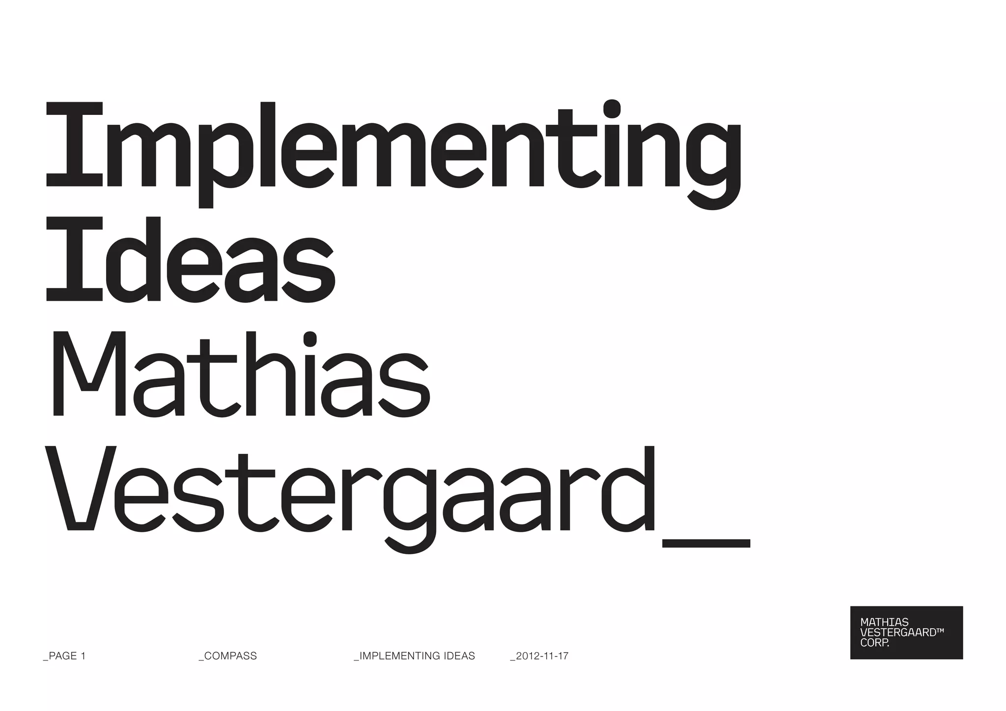 The 7-page document discusses implementing ideas and is authored by Mathias Vestergaard. It includes pages labeled "Compass Implementing Ideas" from 2012-11-17. The final page notes that all rights are reserved for Mathias Vestergaard Corp and provides contact information for the author.