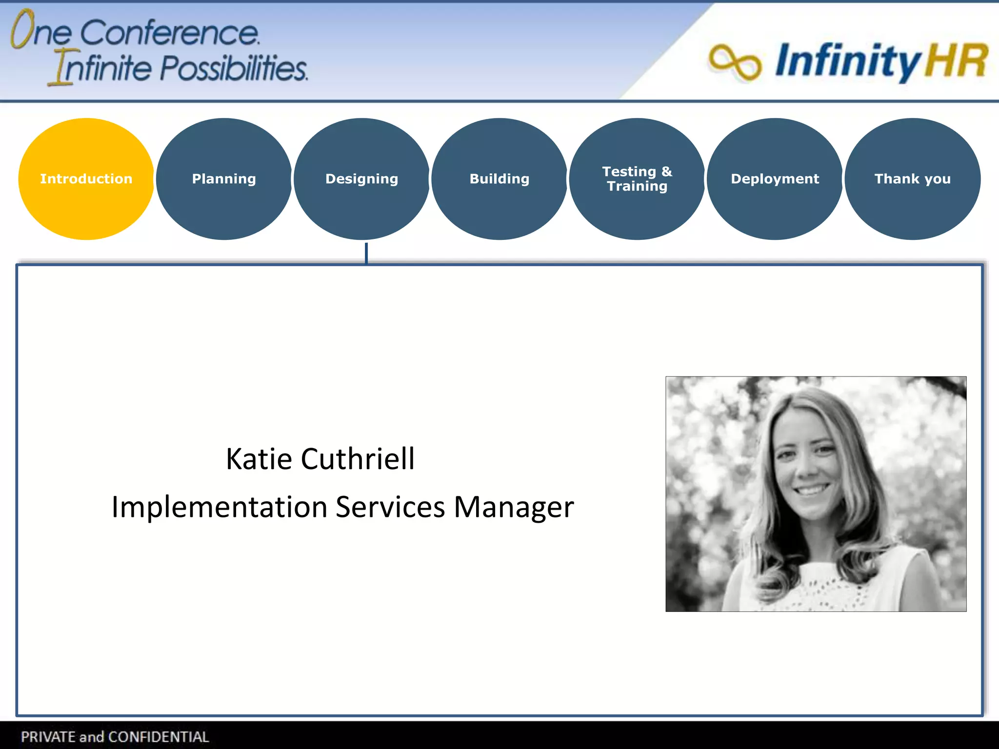 This document outlines the key steps for successfully implementing the InfinityHR system. It discusses (1) planning and preparing by understanding needs, setting goals, and building a timeline, (2) designing an optimal solution by focusing on priorities and recommendations, (3) building by providing clean data and consistent communication, and (4) testing and training through engaging sessions and practicing tasks to ensure expertise before (5) deploying the system and scheduling follow up meetings for ongoing success.