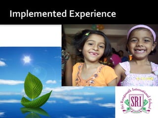The document outlines creative teaching methods and activities used at the Sri Ranganath International School in Bagalkot, India. It describes approaches like reading and writing techniques, socialization activities, experiential learning, question tags, community projects, open book tests, inviting a police band, and kite ballooning. The principal of the school, Dr. Raghueer. Y. V., thanks the reader for learning about the creative capsules in academics implemented at the school.