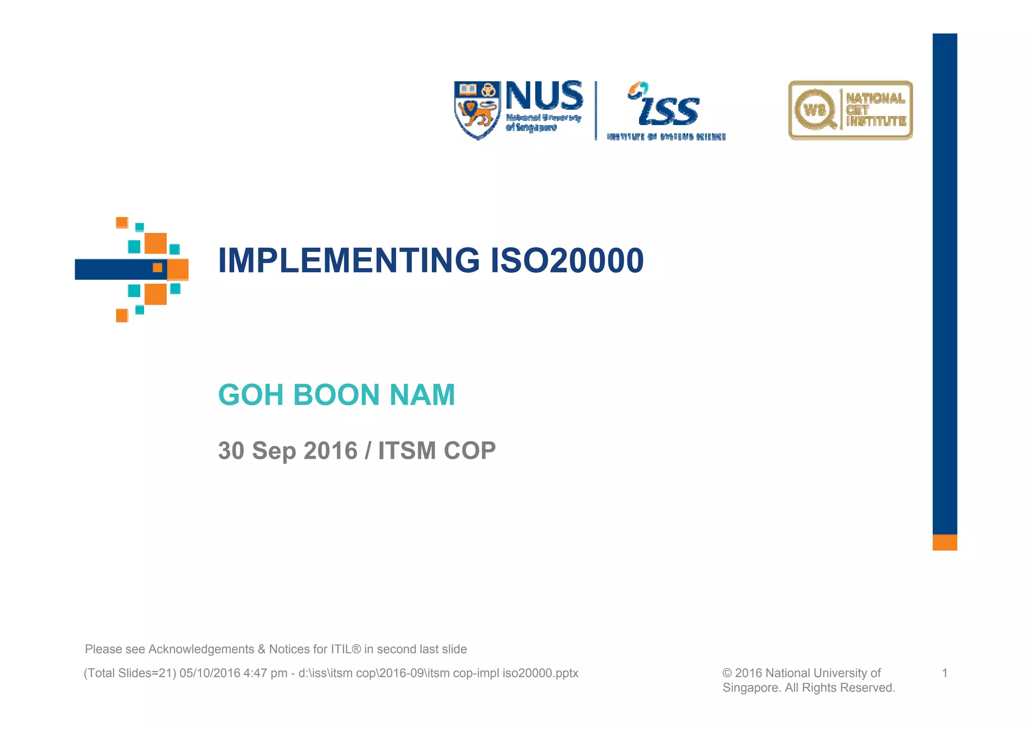 The document outlines the key steps for implementing ISO20000, including using a phased approach, conducting a gap analysis, developing a business case, creating an implementation plan, and focusing on continual improvement. It recommends referencing ITIL for details on specific processes and using ISO20000 Part 5's exemplar implementation plan as guidance. The plan advocates for project support and commitment from management, establishing a skilled project team, and applying lean IT principles to avoid unnecessary documentation and ensure the changes benefit customers.