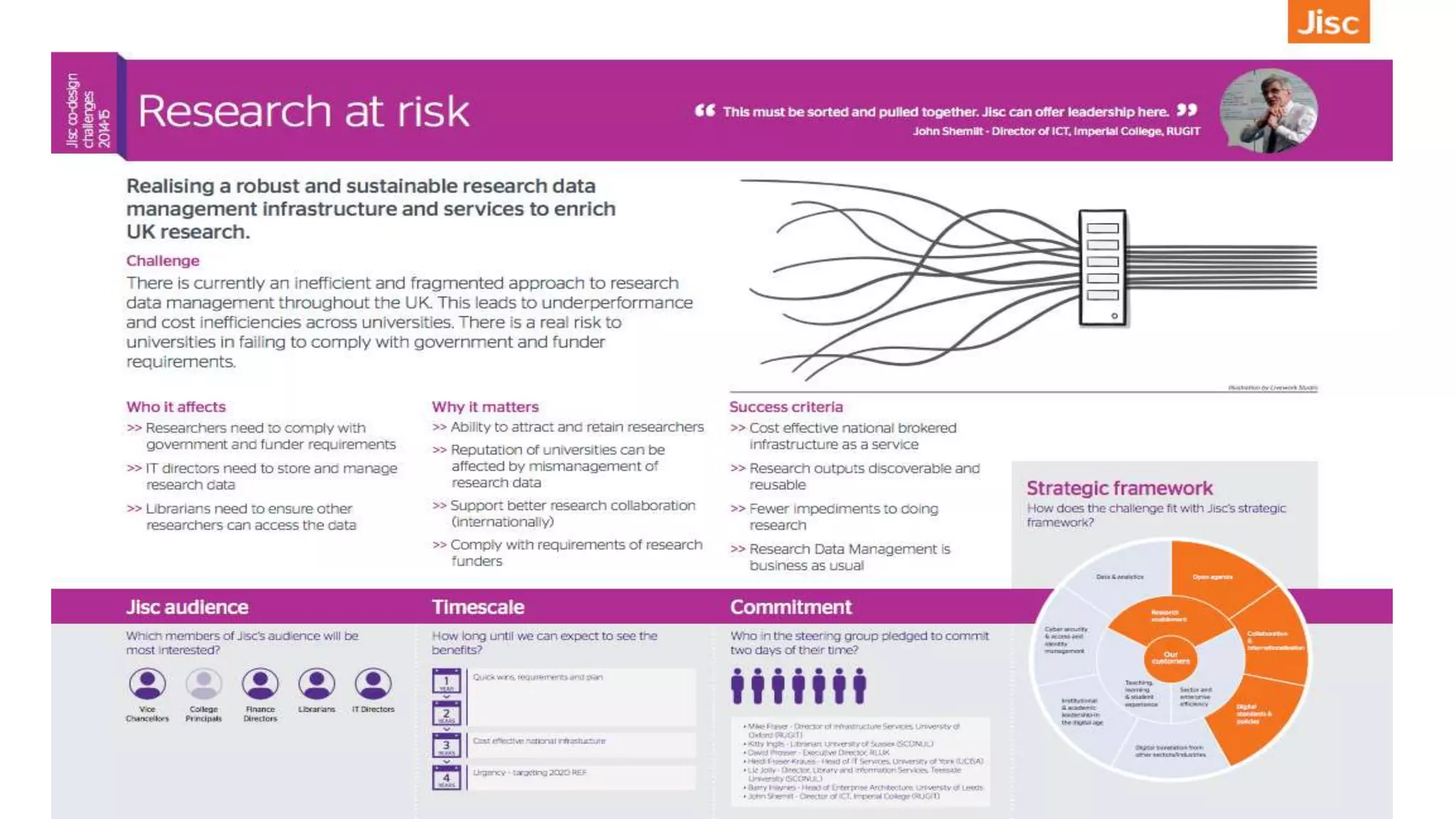 This document discusses research data management and support available from Jisc and the Digital Curation Centre (DCC). It provides background on policy drivers for research data management, outlines support offered by the DCC including capability studies, data management planning tools, and training. It also summarizes results from a 2014 survey of UK higher education institutions which found most progress in policy development and plans, but challenges around staffing, funding, and engagement of researchers. The document concludes with feedback on future priorities such as compelling services, engaging researchers, and shared infrastructure solutions.