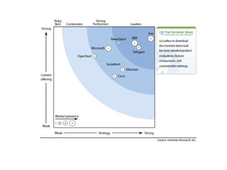 #14 למה לא להוסיף את moodle ? Forrester included nine vendors in the assessment: Atlassian (Confluence), Cisco (Quad), IBM (connections), Jive, Microsoft, NewsGator (built on top of SharePoint), OpenText, Socialtext, and Telligent. Microsoft SharePoint