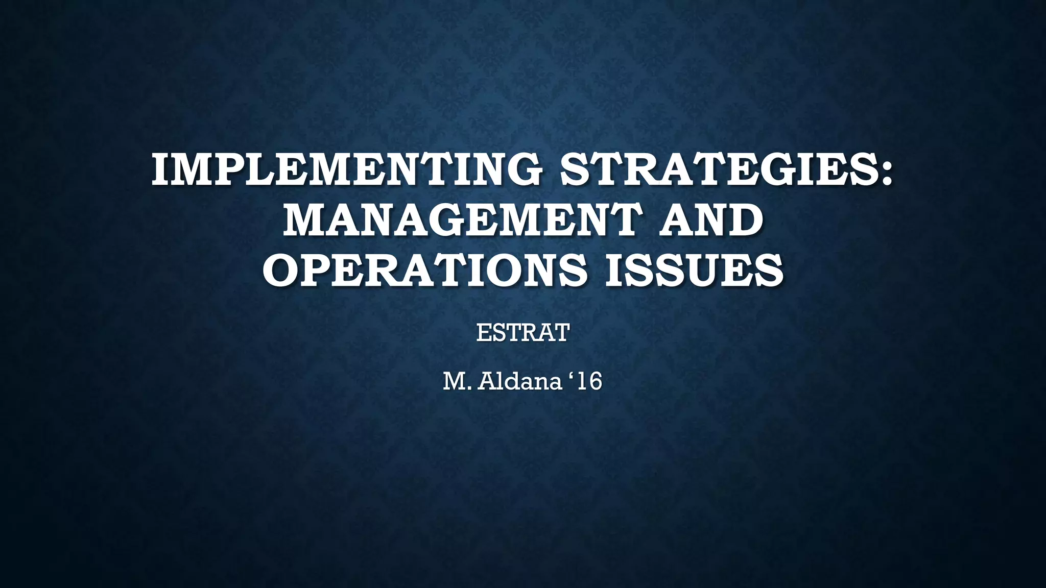 This document discusses various issues related to strategy implementation, including: