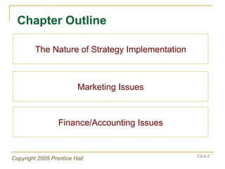 This document discusses various issues related to implementing business strategies across marketing, finance/accounting, research and development (R&D), and management information systems (MIS). It covers topics such as the importance of market segmentation and product positioning in marketing, using financial analysis and budgets for capital acquisition, pursuing innovation through R&D approaches, and utilizing information systems for coordination and cost reduction. The key message is that carefully addressing these functional areas is essential for successfully implementing business strategies.