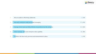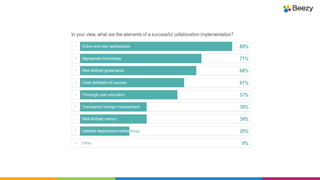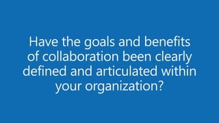 The document discusses the initiative to understand how organizations define, measure, and implement successful collaboration strategies, emphasizing the importance of clear goals and effective change management. It highlights various views on collaboration, from resistance to new technologies to recognizing its value alongside people and technology solutions. The authors, experts in social collaboration, encourage organizations to engage in planning and to refine strategies through experimentation and incremental development.