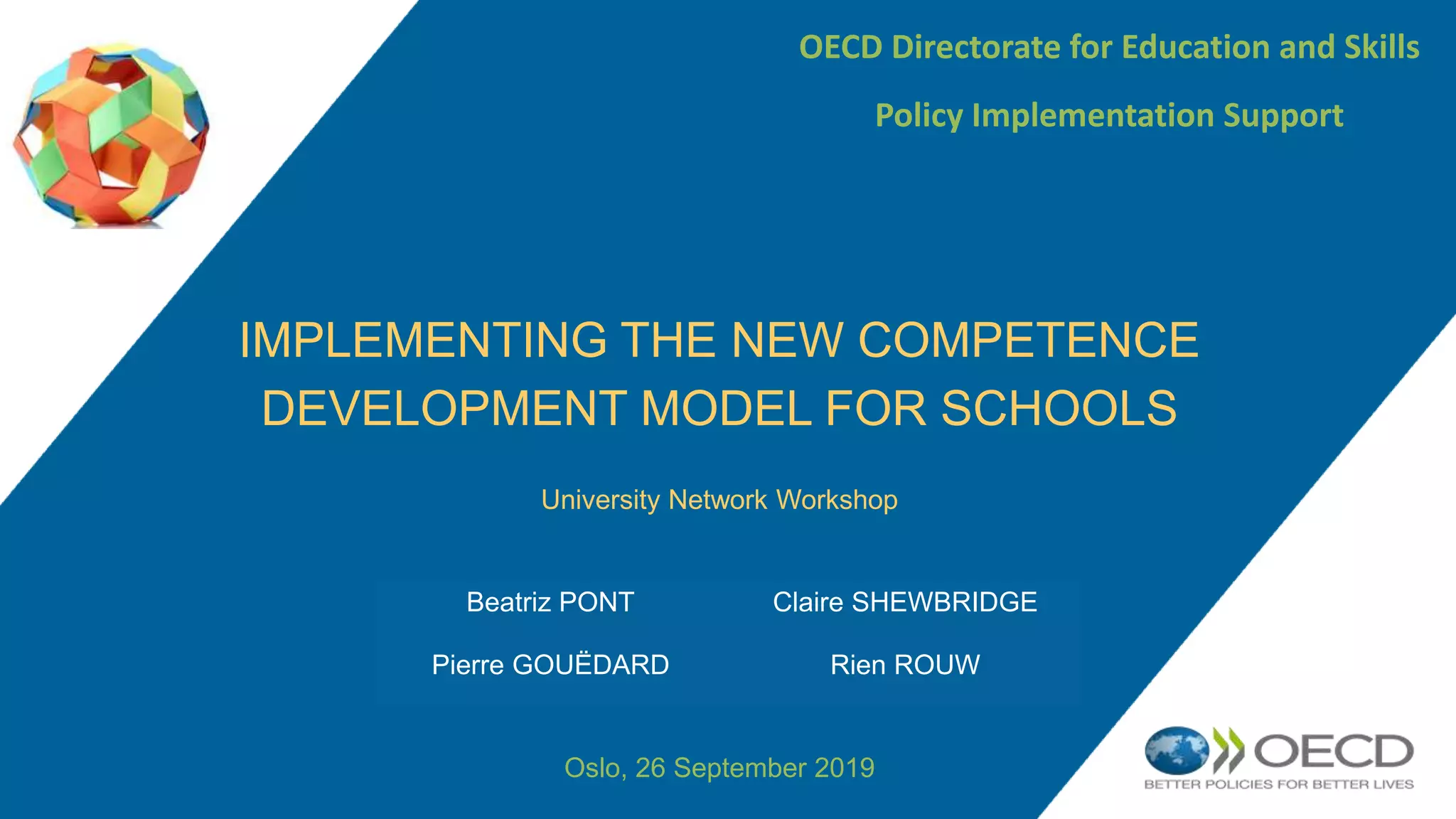 The document discusses the implementation of a new competence development model for schools in Norway, focusing on stakeholder engagement and strategic planning to enhance educational quality. It emphasizes the importance of coherent policies, local ownership, and collaborative professional development, while identifying challenges and providing recommendations for effective implementation. The OECD highlights ongoing reforms and encourages continuous evaluation to ensure the model meets local educational needs.