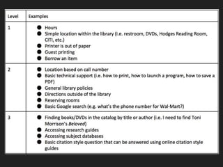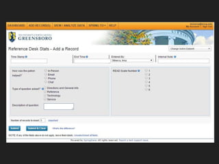 The document outlines the implementation of the READ scale©, a 6-point reference effort assessment tool developed by Dr. Bella Karr Gerlich, and its adaptation at UNCG. It details the logging of nearly 12,000 reference transactions and highlights the differences in handling reference interactions by interns and librarians. The conclusions drawn emphasize the need for improved awareness of skill levels and provide insights for better management of reference services.