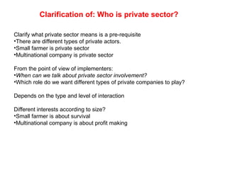 This document discusses the roles and relationships between the private sector and public sector in investing in livestock value chains in Africa. It clarifies that the private sector includes both small farmers and multinational companies. The public sector includes government and producer organizations. While the private sector does not need the public sector to engage, the public sector brings in the private sector and aims to create an environment where both sectors can achieve their goals - profits for private sector and poverty alleviation for public sector. Both sectors need each other and there must be ongoing negotiation to develop balanced regulations and incentives.