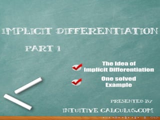 The document discusses implicit differentiation, which allows one to find the derivative of functions defined by a relation rather than explicitly. It gives an example of implicitly differentiating the relation x^2 + y^2 = 25 using the chain rule. Applying implicit differentiation and the chain rule derives the solution y = -x/y, which verifies the original implicit definition of the function.