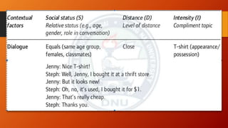 The document discusses teaching pragmatics, which aims to help language learners understand socially appropriate language use. Pragmatics is often overlooked in language education. Explicit teaching of pragmatics through analyzing language examples and contexts is generally more effective than implicit teaching. Various frameworks can inform pragmatics instruction, including noticing hypothesis, output hypothesis, interaction hypothesis, and sociocultural theory. Teachers can use tasks focusing on linguistic or sociocultural aspects to raise pragmatic awareness. Both inductive and deductive approaches show promise, though inductive instruction may lead to longer-lasting pragmatic knowledge.