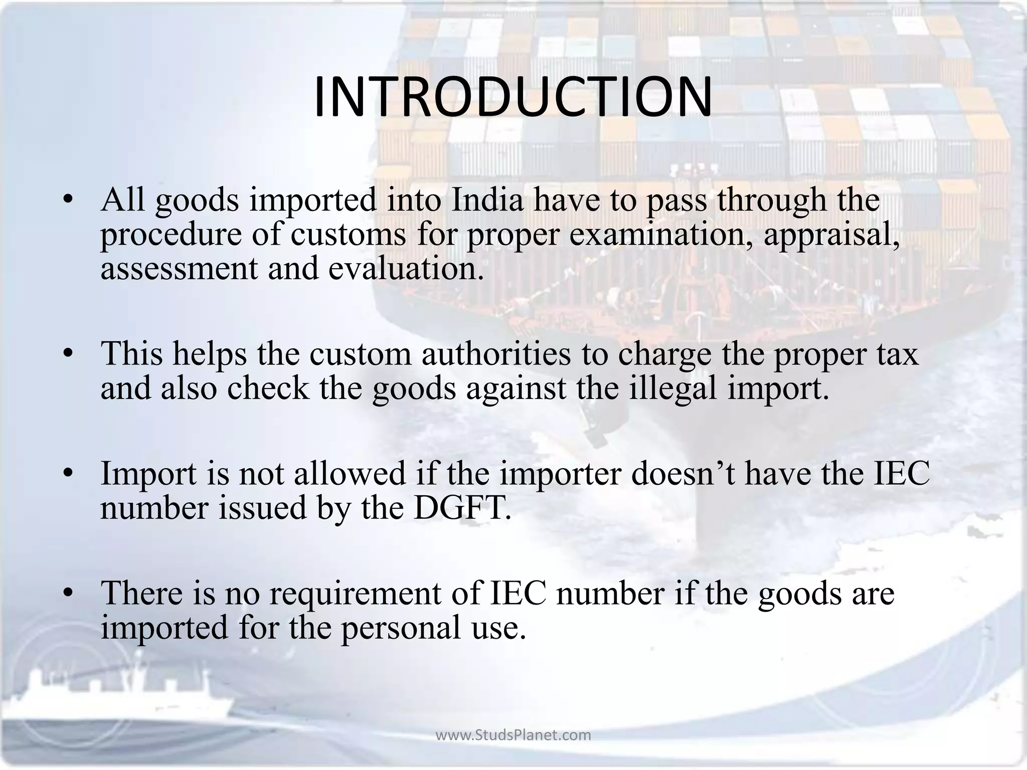 This document provides information on import clearance procedures in India. It discusses the key steps which include filing a bill of entry, assessment of goods by customs authorities, payment of applicable duties, and clearance of goods from the port. There are three main types of bills of entry - white (for home consumption), yellow (for warehousing), and green (for clearance from warehouse). The document also describes differences between the EDI and non-EDI systems for submitting import documents electronically or manually.