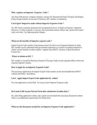 The document provides a comprehensive guide on the online process for obtaining an Importer Exporter Code (IEC) through the Directorate General of Foreign Trade in India. It details the application steps, required documents, and highlights the shift to a digital format that streamlines the process, reduces paperwork, and enhances efficiency. The initiative aligns with the 'Digital India' vision and aims to improve the ease of doing business in the country.