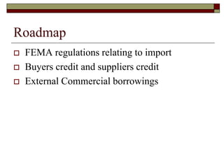 This document provides an overview of regulations and guidelines related to import financing in India. It discusses various import financing options such as buyers credit, suppliers credit, and external commercial borrowings. It outlines regulatory requirements for import documentation, payment methods, permissible end uses of funds, security options, and approval processes for import financing exceeding certain thresholds.