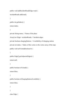 The document outlines a Java implementation of a roadmap system that includes classes for vertices and edges, representing locations and connections on a map, respectively. It provides command-line functionalities to load maps, check connections between locations, and determine the minimum number of assistance cars needed. The core functionalities are wrapped in a class that handles loading data from map files and provides methods for various query types, focusing on charging station availability.