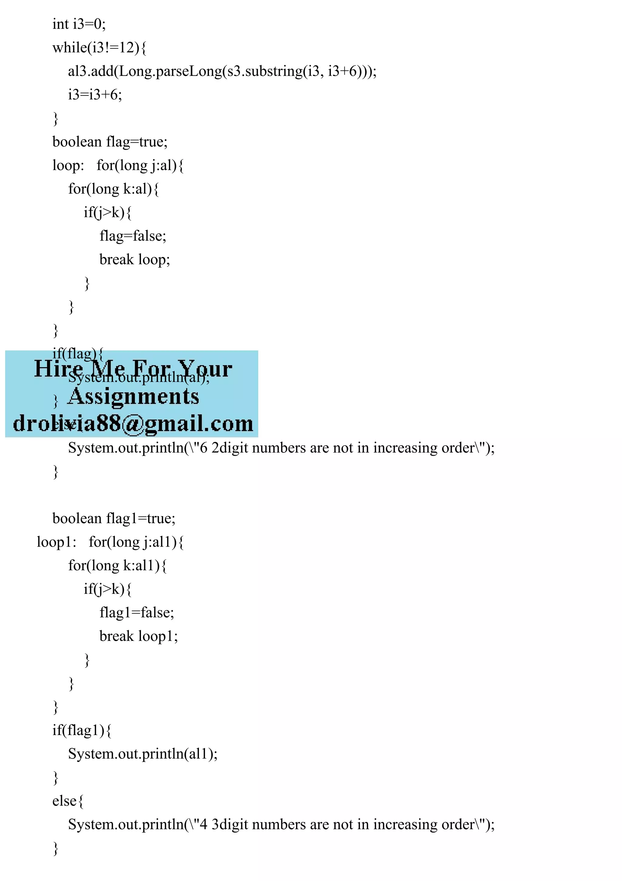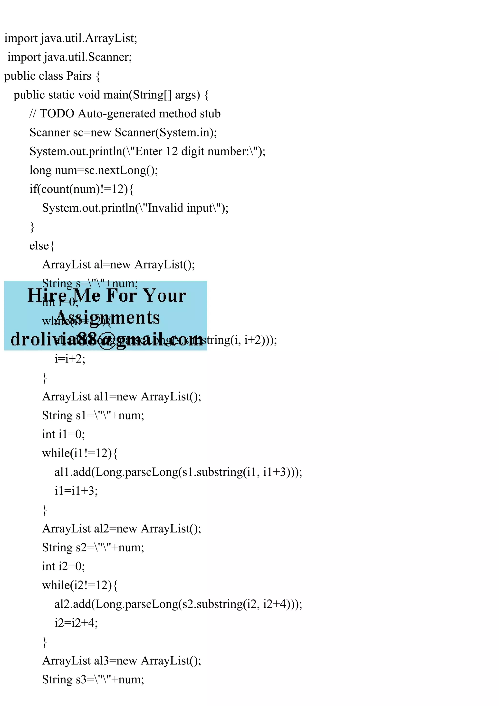The program takes a 12-digit number as input and splits it into pairs of 2, 3, 4 and 6 digits. It stores each pair in ArrayLists and checks if the numbers in each ArrayList are in increasing order, printing the ArrayLists if in order or an error message if not. It defines a count method to get the digit length of the input number.