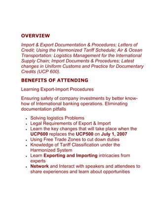 This document announces an import/export seminar in and around Pune, India that will provide an overview of import/export documentation and procedures. The seminar will cover topics like letters of credit, tariff classification, transportation logistics, import/export documentation requirements and procedures, export financing, intellectual property protection, export controls and more. It is aimed at business executives, managers, lawyers, consultants and others involved in import/export to help them better understand the legal requirements and intricacies of international trade. Speakers will include leading experts in various areas of import/export.