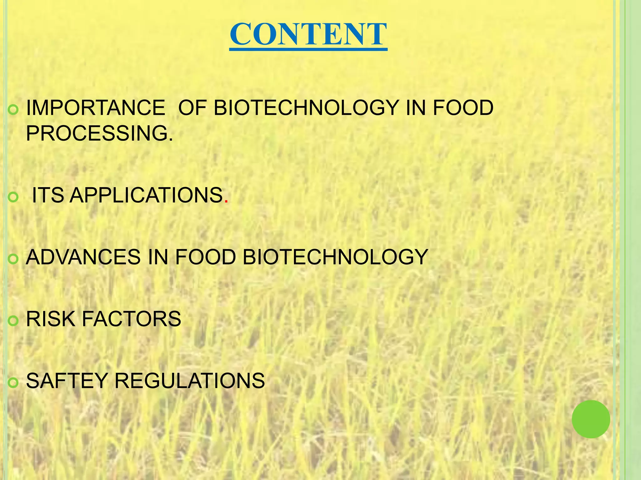 The document discusses the significance and applications of biotechnology in food processing, highlighting its role in enhancing food safety, quality, and production efficiency. It addresses advancements such as genetically modified crops and microbial techniques that improve food properties while noting associated risks like food allergies and contamination. Safety regulations are crucial to prevent cross-contamination during food production and packaging.