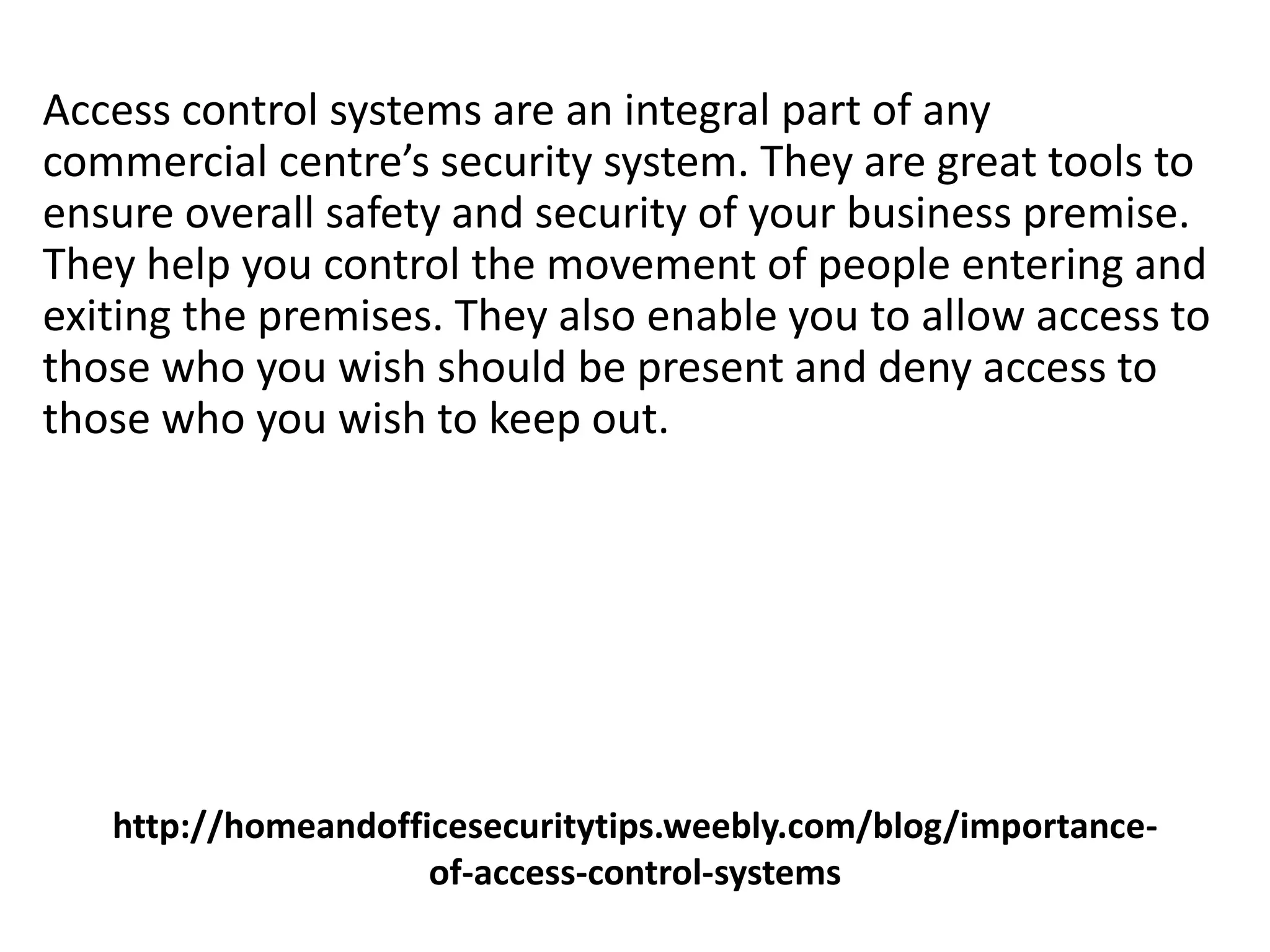 Access control systems are essential for the security of commercial centers, allowing businesses to manage the movement of individuals within their premises. They enhance overall safety by granting or denying access based on specific permissions. For more information, the document includes contact details for Doorway Services (Automation) Ltd.
