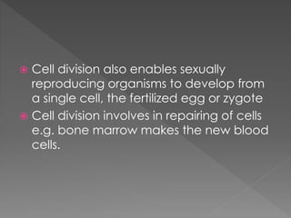 Cell division is important for reproduction, growth, and repair in organisms. It enables unicellular organisms to reproduce by dividing and multicellular organisms to grow from cuttings. Sexually reproducing organisms also develop from a single fertilized egg through repeated cell division. Cell division distributes genetic material equally and is necessary for development, while its absence would quickly lead to death. Meiosis and genetic recombination through processes like crossing over during meiosis increase genetic variation within populations.