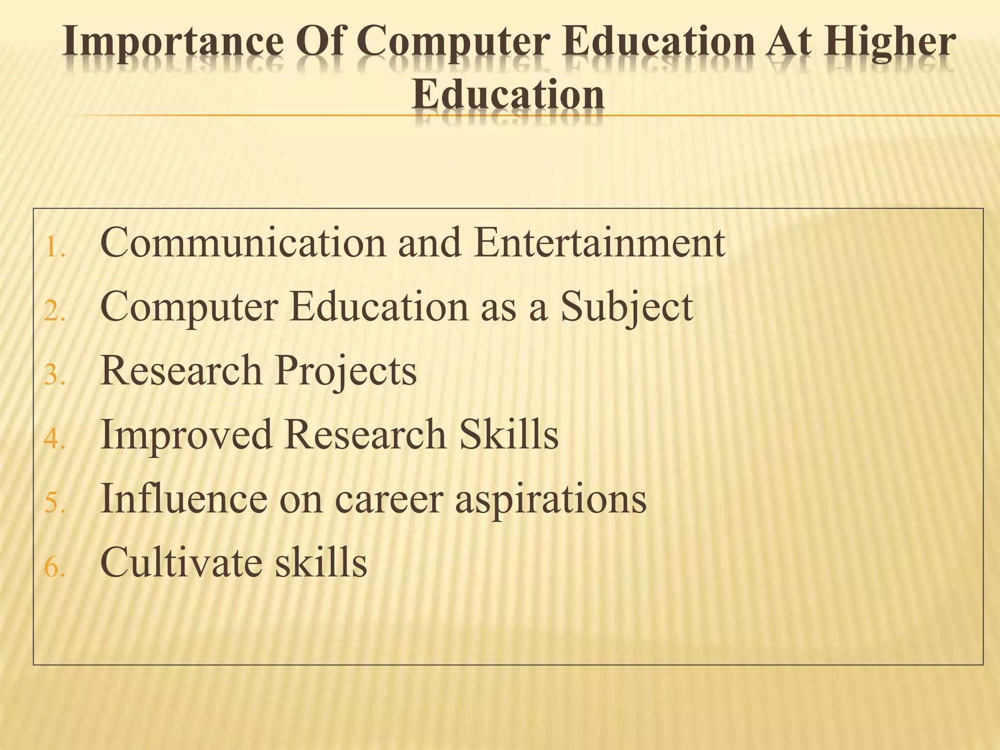This document outlines the importance of computer education at both the secondary and higher education levels. At secondary level, it helps students develop basic computer skills, learn software tools like PowerPoint, and use educational software which can improve performance and build confidence. At higher education, computer skills are important for communication, entertainment, research projects, developing research abilities, influencing career choices, and cultivating skills through blogs, online learning, and information sharing.