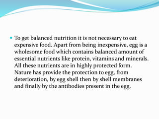 Egg is a nutritious and inexpensive food that contains balanced amounts of essential nutrients like protein, vitamins, and minerals. It provides high-quality protein and is an excellent source of various vitamins and minerals. The major components of an egg are albumen (egg white) and yolk. Albumen contains over half of the egg's protein and various vitamins and minerals. The yolk contains all of the egg's fat and cholesterol but also provides various important vitamins. Eggs contain antioxidants and other compounds that may help reduce the risk of diseases. Overall, eggs are a healthy and affordable food choice that provides many important nutrients.