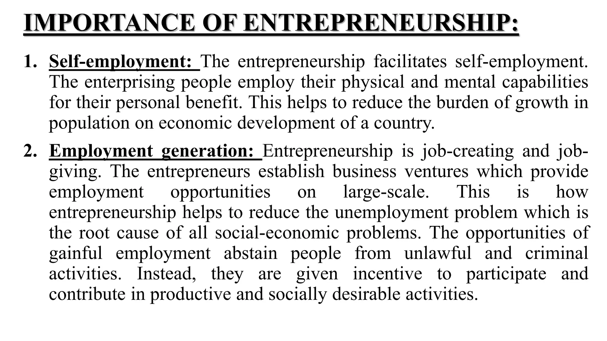 The document discusses the importance of entrepreneurship. It notes that entrepreneurship facilitates self-employment, generates employment opportunities on a large scale, and acts as an agent of change by conceiving and developing new ideas. Entrepreneurship also achieves social stability by meeting societal demands and ensuring regular supply of goods and services. It allows for the optimum utilization of resources and plays a significant role in capital formation and balanced regional growth. Overall, the document emphasizes that entrepreneurship is crucial for economic development and reducing issues like unemployment, poverty, and concentration of economic power.