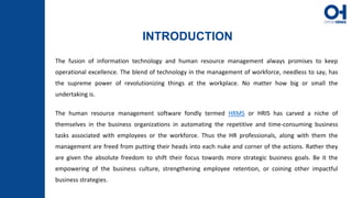 The document highlights the importance of HRM software in automating workforce management and facilitating strategic business goals. It outlines various functions of HR software, such as payroll management, employee recruitment, and performance evaluation. Additionally, it emphasizes the role of HR software tutorials and demos in helping users effectively navigate the software's features and functionalities before making a purchase.