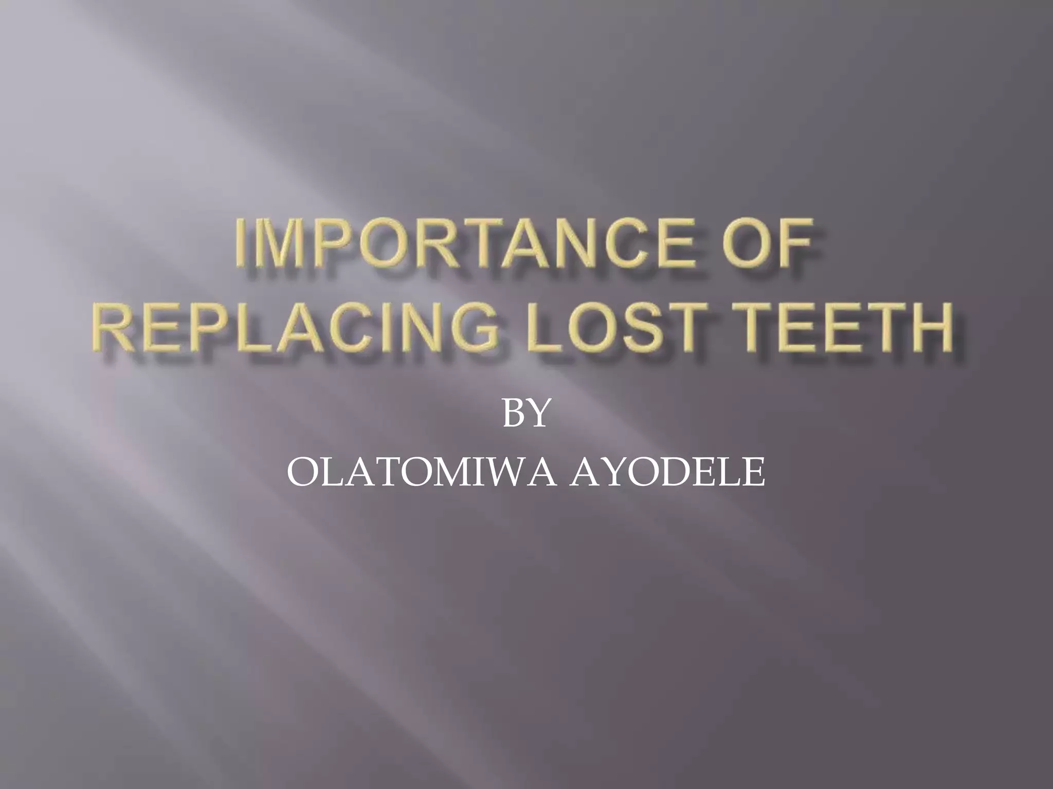 The document discusses the causes and consequences of tooth loss, including periodontal diseases, tooth decay, dental trauma, and certain risk factors like diabetes and smoking. It emphasizes the importance of replacing lost teeth to maintain oral health, prevent additional tooth loss, and avoid embarrassment. Common replacement options include full dentures, fixed bridges, and dental implants, with implants being highlighted for their permanence and resemblance to natural teeth.